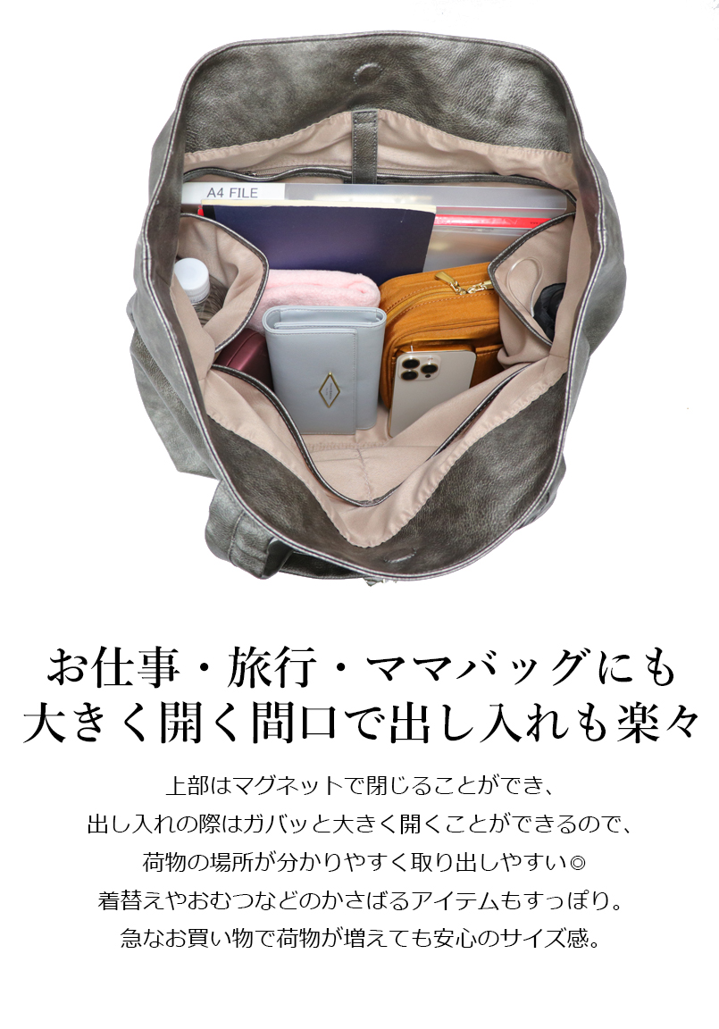 しっかり収納できる大容量デザインなので、デイリー・旅行・お仕事でも、荷物が多い日に安心の収納力。