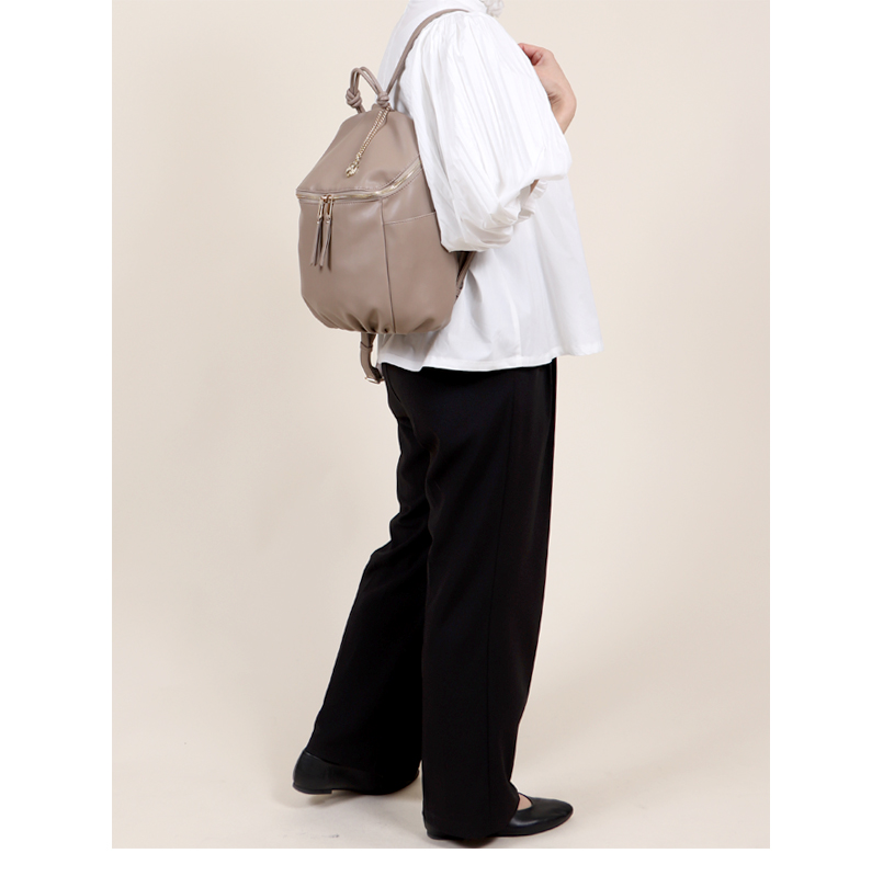 間口はダブルファスナー式になっており、ファスナーの持ち手部分にもタッセルが付いた持ちやすく開閉しやすい工夫がされています。