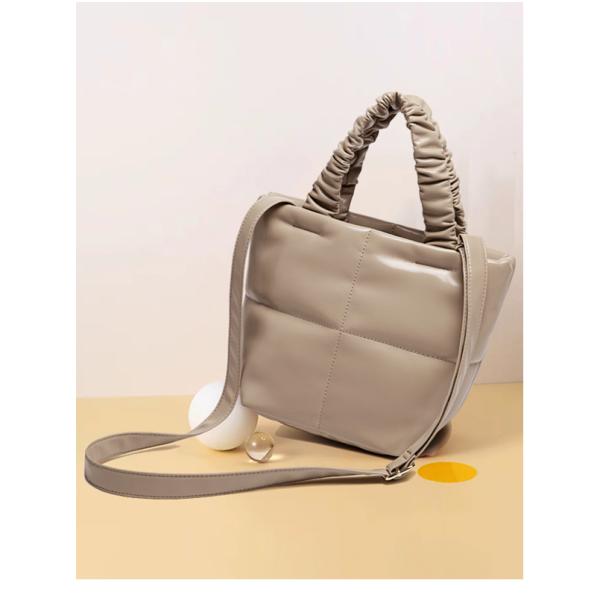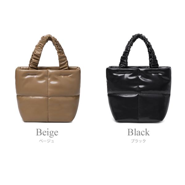 光沢のある合皮素材にギャザーを寄せた持ち手がお洒落なトートバッグ。