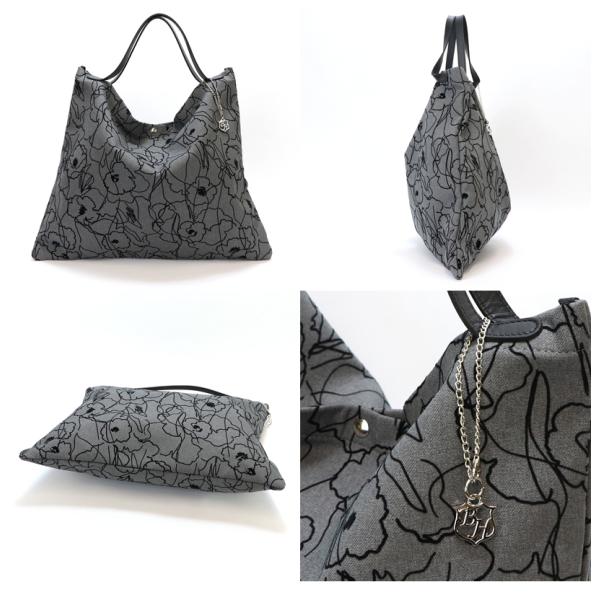 持ち手部分に使用した本革素材に加え、全体に描かれた花柄がシックな大人の女性を演出します。