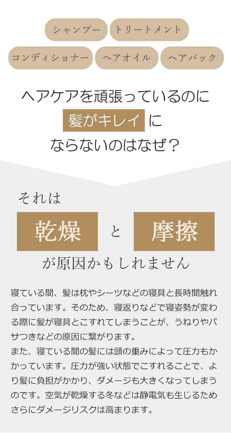睡眠中の髪をしっとり保湿し、乾燥や刺激からからやさしく守ります。
