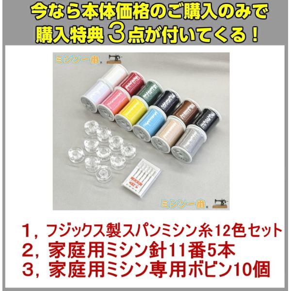 ハードケース、使いこなしDVD、ボビン、ネジ回し、ドライバー、はとめ穴パンチ、ミシンブラシ、糸こま押え、ミシン針、ジグザグ押え<J>ボタン穴かがり押え<A>たち目かがり押え<G>片押え<I>レシピ、まつりぬい押え<R>リッパー、付属品バッグ、取扱説明書、早見表、型紙