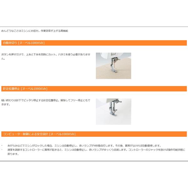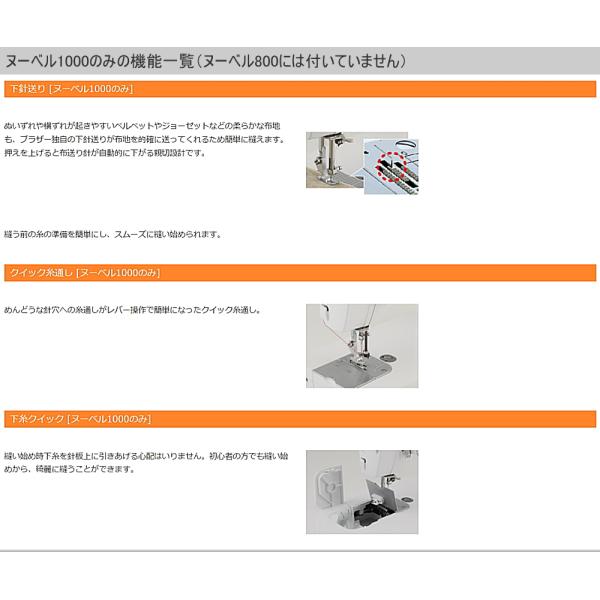 分割式自由押え(下針送り用押え),三巻押え,コンシール〓 ファスナー押え,片押え,ふつうぬい用押え,ミシンブラシ,ボビン(5個),フットコントローラー,頭部カバー,下針交換ゴム<ヌーベル1000のみ>,ネジ回し(中),油差し,電源コード,取扱説明書,補助テーブル,下針<ヌーベル1000のみ>,ネジ回し(小),ミシン針,糸こまキャップ,早見表,ひざ上げレバー,分離板(表・裏地ぬい合わせプレート)締めねじ<ヌーベル800はオプション>