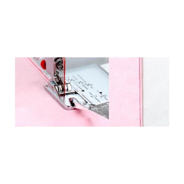 押さえの手前が布を巻き込みやすい形になっているので、布端を約3ミリ幅で三つ折りに縫う事が出来ます。薄物のスカートの裾やスカーフの布端の始末に最適です。