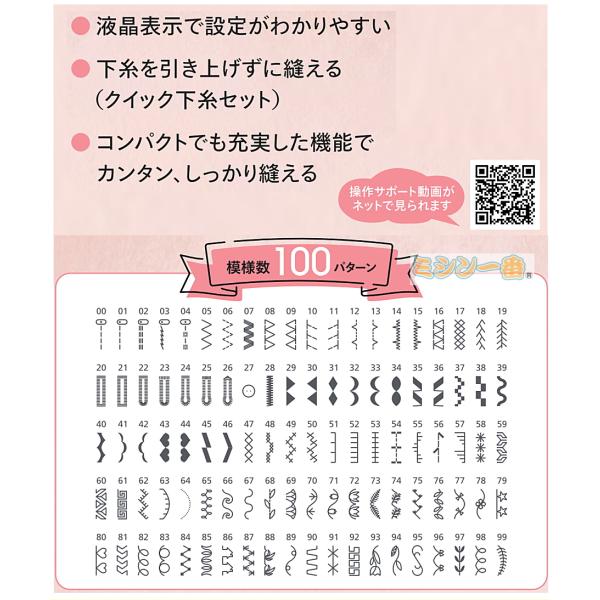 ・ジグザグ押え(基本押え) ・ファスナー押え ・ボタンホール押え ・ボタン付け押え ・縁かがり押え ・サテン押え ・ブラインドステッチ押え/ボビン(3 ヶ)/ ミシン針(14番 × 3 本)/ 棒定規/ 補助糸立て棒/ 糸ごまクッション/ 糸ごま押え(大)/糸ごま押え(小)/ブラシ付きシームリッパー/ 三角ドライバー/ ドライバー(小)/ 模様一覧プレート/ プレートスタンド/ 電源コード/ 取扱説明書