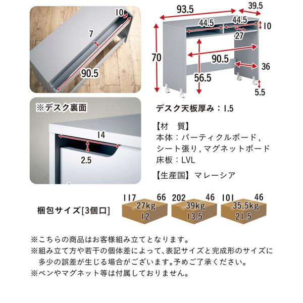 デスク:W93.5 x D39.5 x H70cm(キャスター含む)