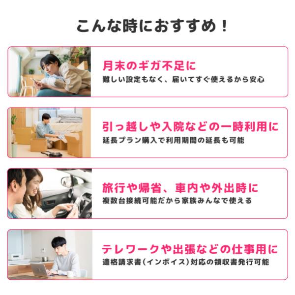モバイルwifiルーターは、旅行や帰省、一時帰国、入院、引っ越し、出張、テレワーク(在宅ワーク)、移動中の車内など場所を選ばず使えるからとっても便利!