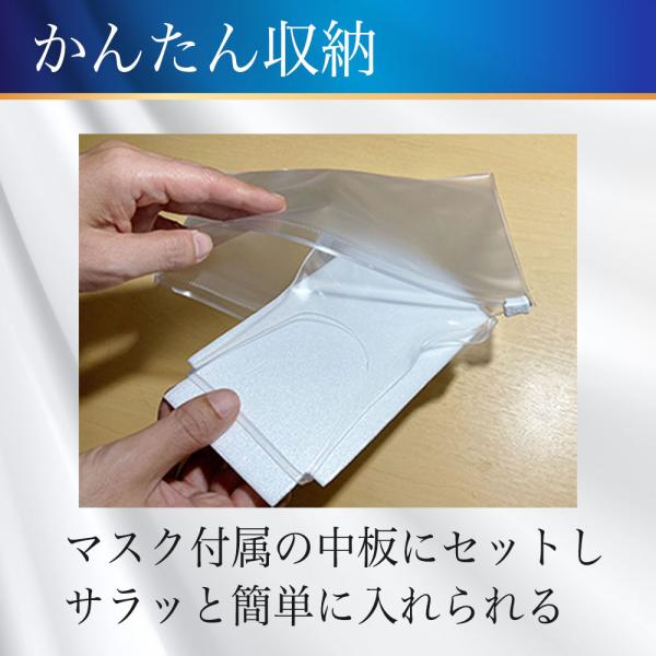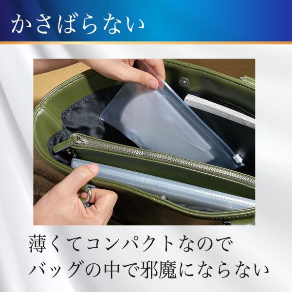 デイリータイプとクリアタイプとのMSサイズ Lサイズ、どちらもきれいに収納できます。またケースへの粘着も起きない抗菌PVCフィルムを採用し、中板にマスクを折りたたんで、衛生的に収納でき、シリコンがケースに粘着することがありません。ポケット部分には塩ビ製のレールファスナーを採用し、スムーズに出し入れ/収納することができます。