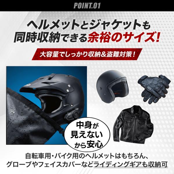 フルフェイス対応の大容量:大型サイズでヘルメットはもちろん、グローブや小物もまとめて収納