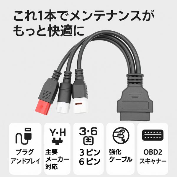 3-in-1設計で、幅広いバイクのECU診断に活用可能。OBD2スキャナーと接続するだけで、エンジン状態やエラーコードのチェック、リセットなどが簡単に行える