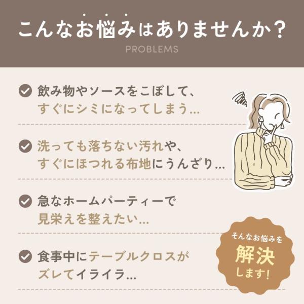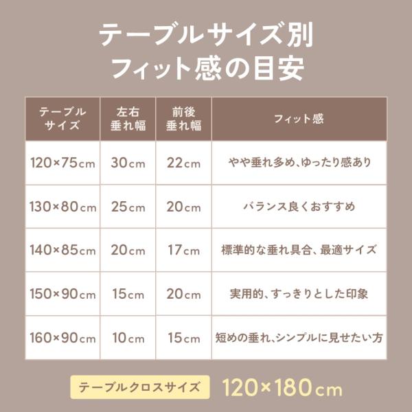・120cm×180cmの大判サイズで、様々な大きさのテーブルに対応します。