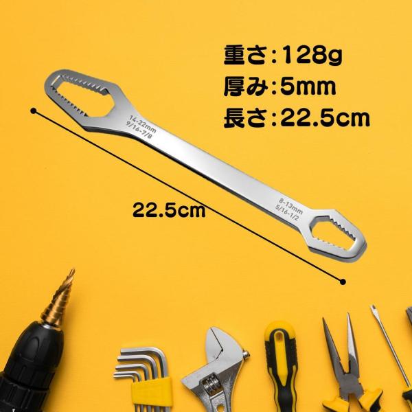 このレンチは、8mmから22mmまでの多種多様なボルトサイズに対応可能。