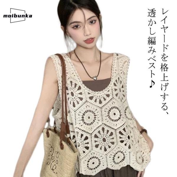 ベスト 春夏 フェミニン クロシェ編み おしゃれ Vネック レディース 透かし編み プルオーバー かぎ編み ニットベスト 無地 レイヤード きれいめ