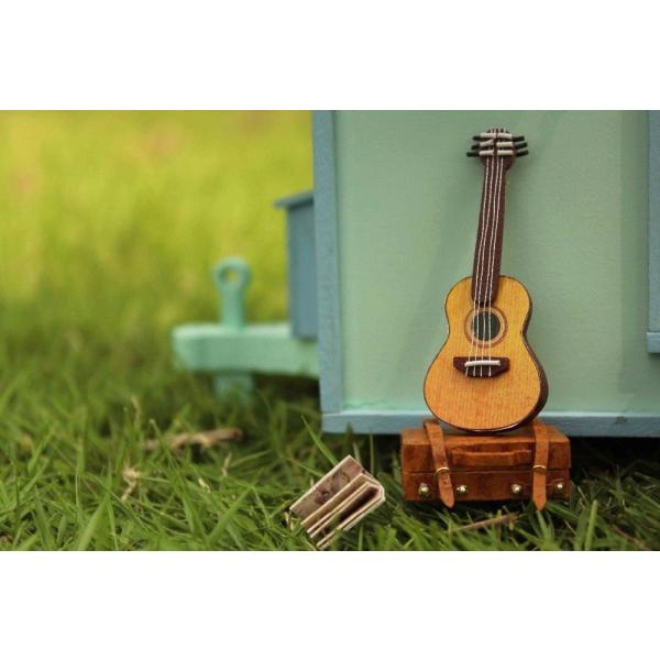 本商品はミニチュアのドールハウスの手作りキットになります。アコースティックギターや壁の色合いなどがカントリーフレンチ風の魅力的なお部屋です。繊細でリアルな小物が可愛い♪ライトは実際に点灯します。