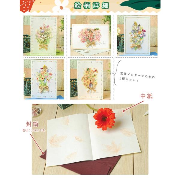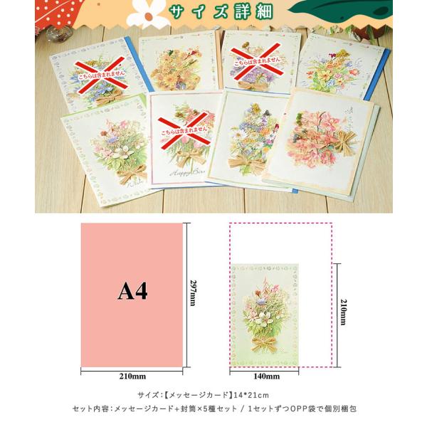 サイズ:【メッセージカード】14*21cm (ほぼA5サイズ) セット内容:メッセージカード+封筒×5種セット(バースデーカードを除く一般的なメッセージのもののみ5種) / 1セットずつOPP袋で個別梱包