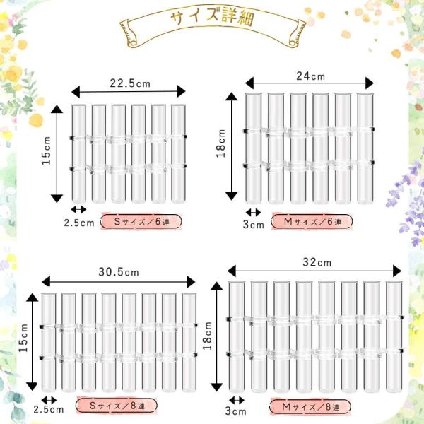 【サイズ】 [ Sサイズ ] 試験管:直径2.5×高さ15cm 6つ連結時:幅22.5×高さ15cm [ Mサイズ ] 試験管:直径3×高さ18cm 6つ連結時:幅24×高さ15cm ※写真に写っているフラワーは付属いたしません