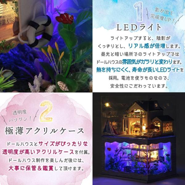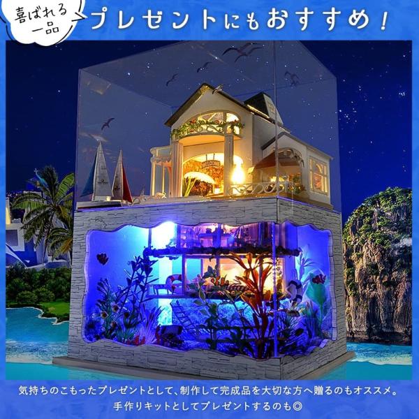 本商品はミニチュアのドールハウスの手作りキットになります。地下にはなんと水族館のある幻想的なドールハウスです。2色のライトが美しい。海のモチーフが盛りだくさん。造形の良い完成済み植物を多く採用し、めんどくさい作業はカット。
