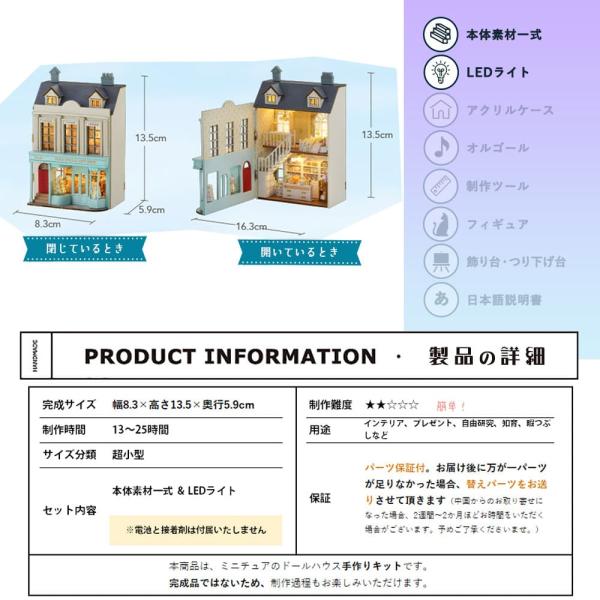 本商品はミニチュアのドールハウスの手作りキットになります。ちいさなちいさな家やショップですが、外見だけではなくインテリアもこだわりが光ります。前面は屋根までパカッと開くことができるので、そっと中を覗けます。本当に小さいのですが、アップで見てもまるで本物のようなリアルさ。シリーズで並べて、まるでパリのような街並みを作ることができます。