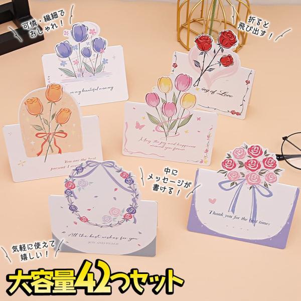 メッセージ カード花束 6種 42枚 大量 徳用 セット 花 フラワー イラスト 英字 二つ折り 飛び出す 3D ミニレター 手紙 レターセット グリーディング