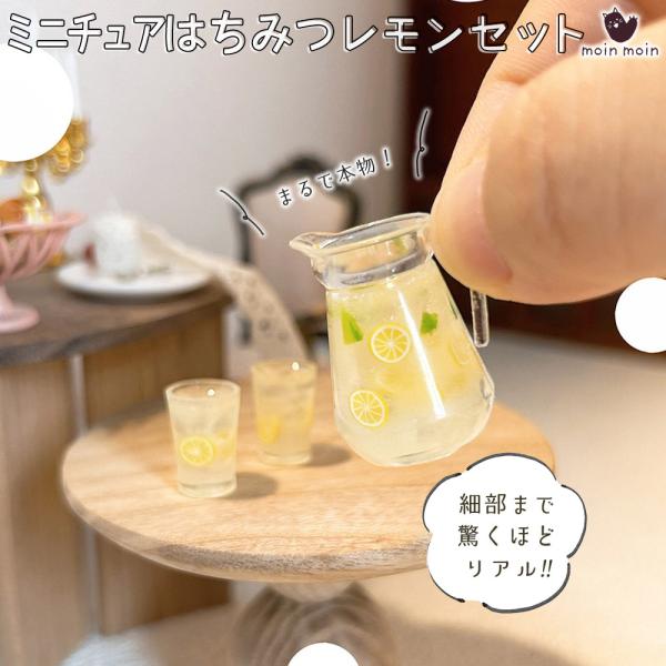 ミニチュアはちみつレモン コップ 2個 & ピッチャー セット 1/6 1/12 スケール ドールハウス|グラス 氷 夏 食器 レモネード イエロー ドール撮影