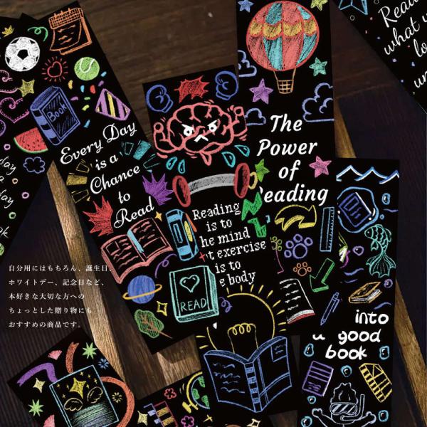 【 まるでチョークで描いたような、カラフルで楽しい黒板アート風のおしゃれしおり 】 それぞれのしおりには英語の名言やポジティブなメッセージが書かれており、ページを開くたびに前向きな気持ちに。「Reading is cool」「Every day is a chance to read」など、読書の魅力を再発見できる言葉が散りばめられています。