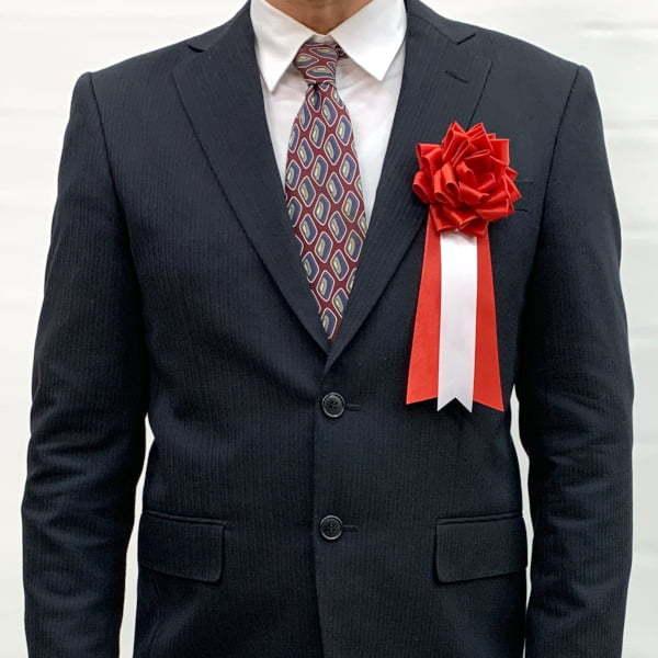 ・リボン記章の花とタレは別々に分かれた状態で届きます。タレに両面テープが付いていますので、使用時に花に取り付けてください。