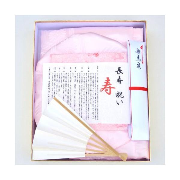 ピンク色のちゃんちゃんこ・帽子・白扇1本・風呂敷の長寿祝いのセットとなります。