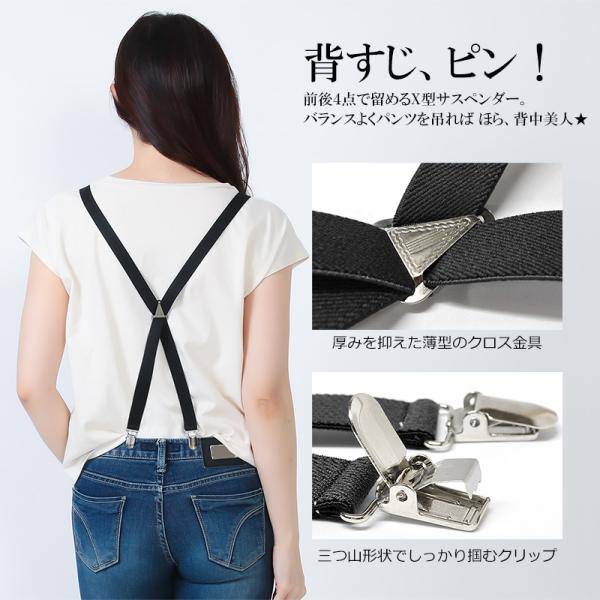 4つのクリップでバランスよくパンツを吊れる、定番のX型サスペンダー。