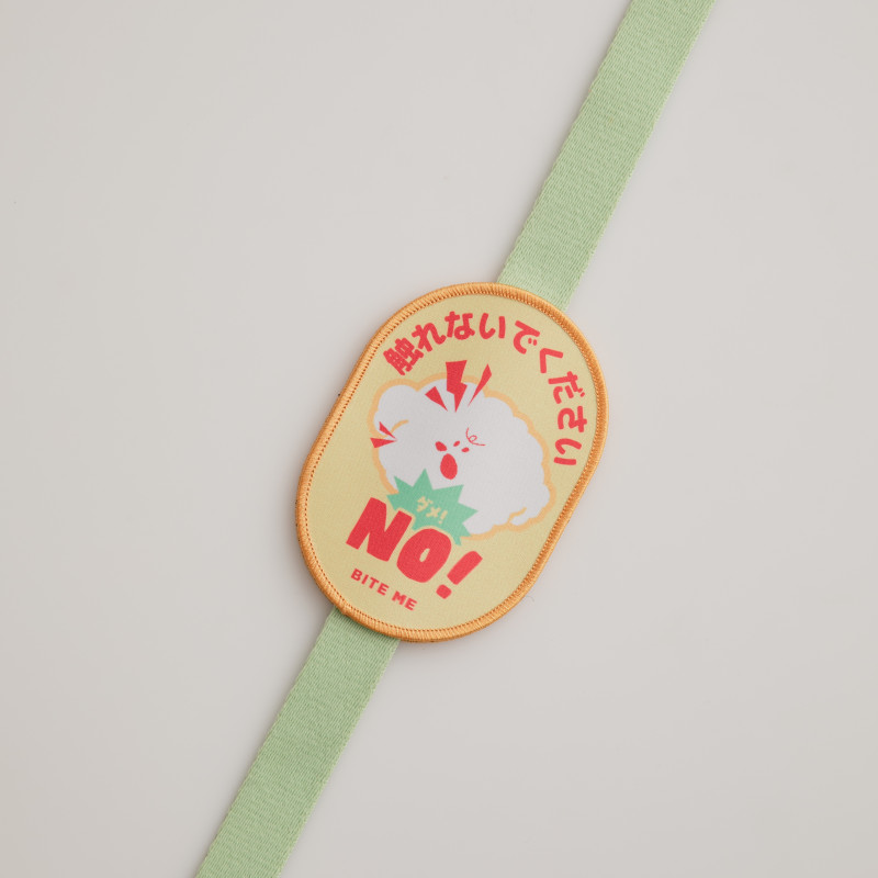 韓国ブランドBITE MEの、お散歩中の意思表示ワッペン。「Yes, you can greet me! (挨拶OKです!)」と周囲に可愛く伝えます。
