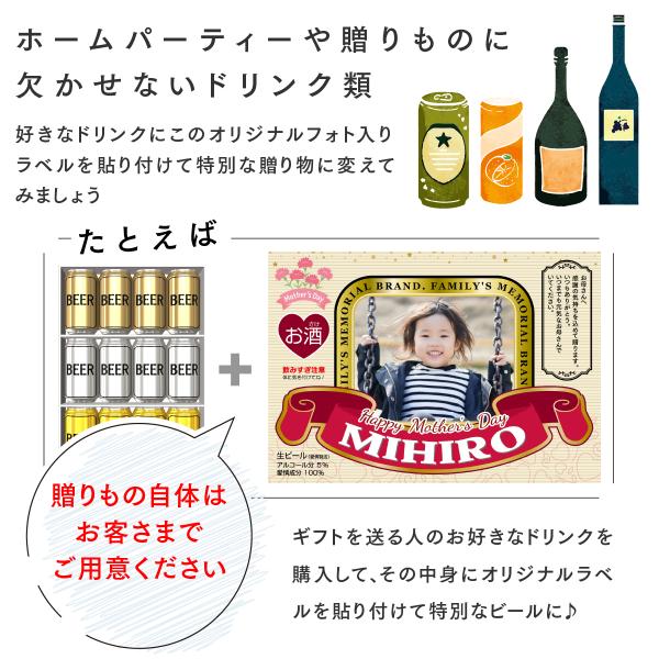 特別な日にオリジナルなドリンクをプレゼント♪特別なビールなんて買わなくたってMONOLIKEのこの写真入りラベルシールを普段から気に入って飲んでいるドリンクに張り付ければ普段の2倍も3倍もおいしい&楽しい飲み物の出来上がり♪お子さんやお孫さんのかわいい写真入りのビールにニヤニヤが止まらない!いつもより飲みすぎ注意( *´艸`)