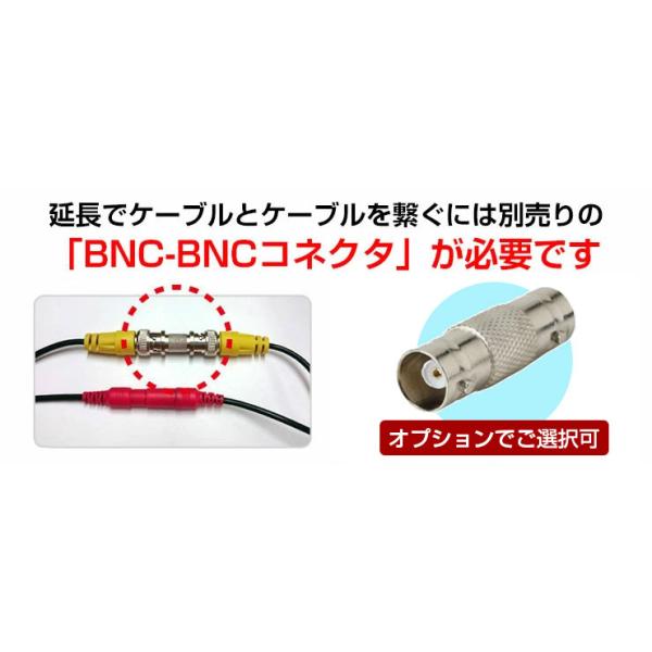 ・ケーブル同士を繋げて延長する場合は、接続用コネクタ(BNC-JJ(メス)-(メス))が必要となります。