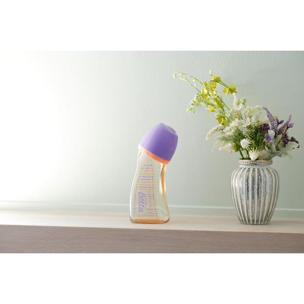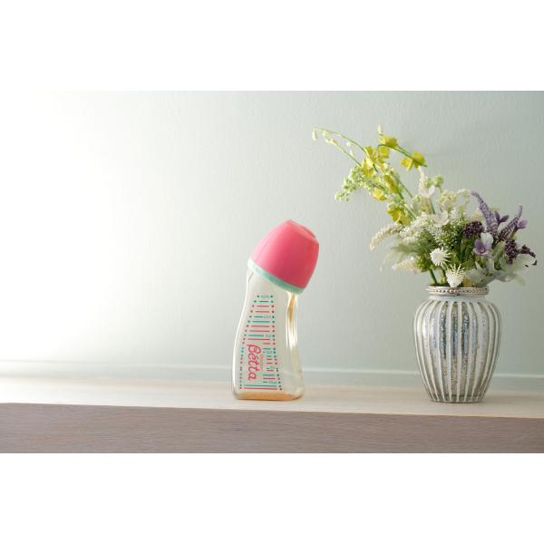 ドクターベッタの広口タイプは、ドクターベッタ哺乳びんの利点「お耳に安心+誤嚥を防ぐ+ゲップの軽減」に加え、洗いやすく、さらに調乳がしやすく、咥えた時の触感がママのおっぱいにより近い哺乳びんです。また、太く、高さのあまりない形状は安定感があり、倒れにくいため調乳などの際は快適に使用することができます。 哺乳びんに付属する乳首は、「ブレイン乳首」広口タイプ。ソシャクすることの大切さを考えて作られました。赤ちゃんが吸うとなみなみ部分が伸びて赤ちゃんのお口と舌にフィット。ママの乳首のように上アゴと下アゴをしっかり上下に動かして飲める乳首です。ボトルの素材は透明感のあるはちみつ色のプラスチック製 PPSU。衝撃や熱に強いから、初心者ママやイクメンパパの強い味方になること間違いなし !