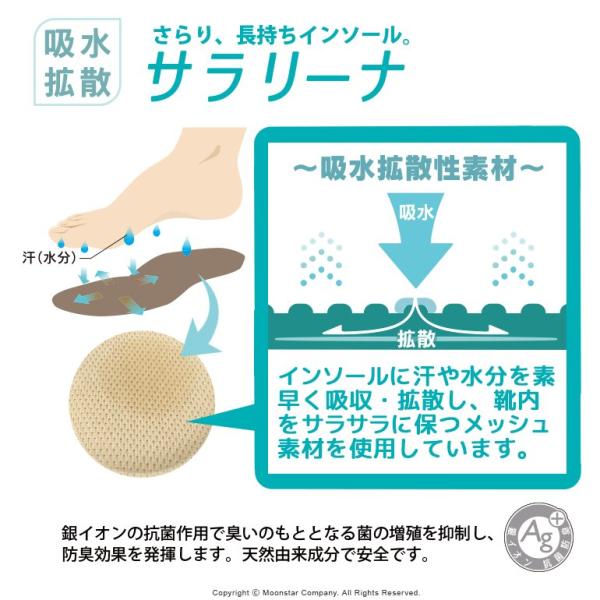 【サラリーナ】汗や水分を素早く吸収・拡散し、靴内をサラサラな状態に保つメッシュをインソールに採用。