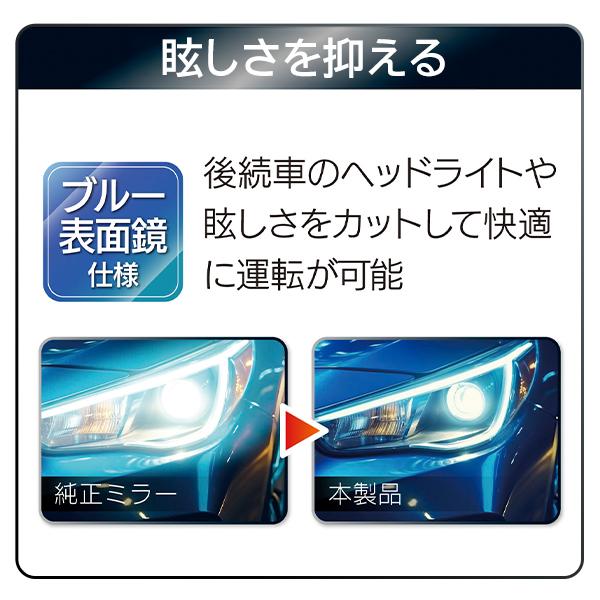 ブルー表面鏡仕様で後続車のヘッドライトや眩しさを抑えて快適に運転ができます。