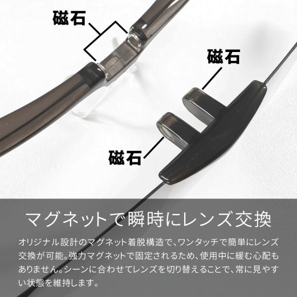 レンズ2枚セットでフレームにマグネットで装着すれば瞬時にレンズ交換可能!