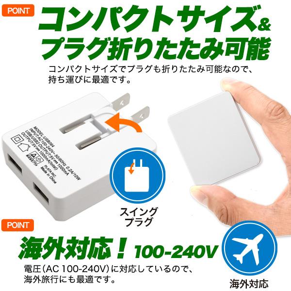 USB コンセント ACアダプター プラグ 2ポート 薄型 急速充電 充電器 2台同時充電 折りたたみプラグ 携帯 スマホ iPhone 旅行 送料無料 50K◇ NEW薄型1Aアダプタ