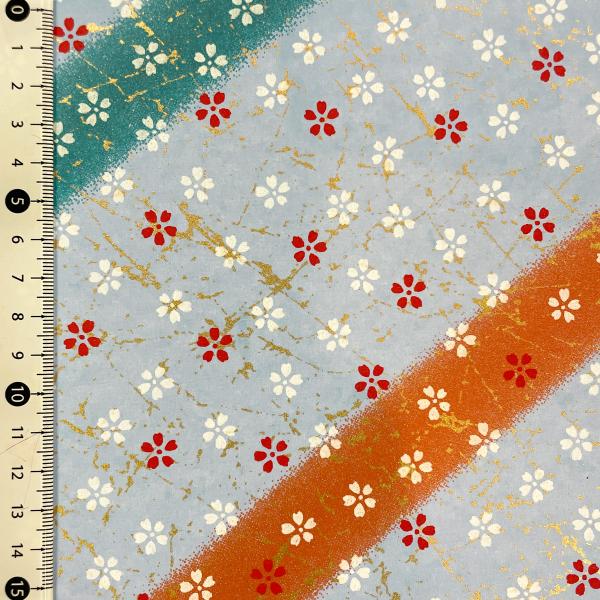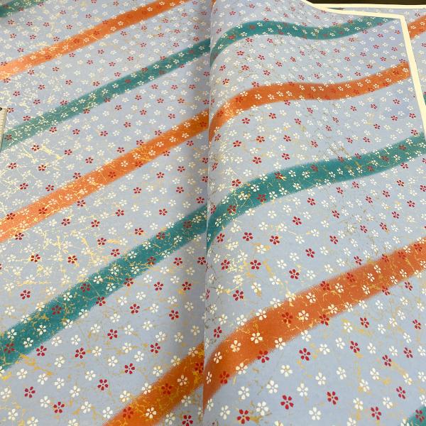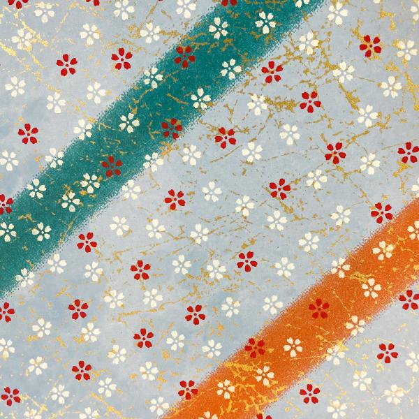 友禅和紙 水色の氷割模様に 赤 白の桜 オレンジと緑の斜め縞 大判 約63x93cm 千代紙