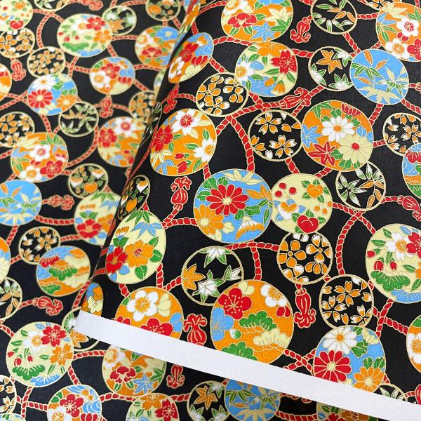 華やかな友禅和紙 毬と組み紐 黒 大判 約63x95cm 千代紙