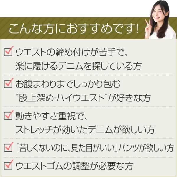 【丈詰め不要】選べる股下&感動ストレッチ!ウエスト総ゴムと深め股上で、お腹ゆったり・しゃがんでも安心の快適デニム。