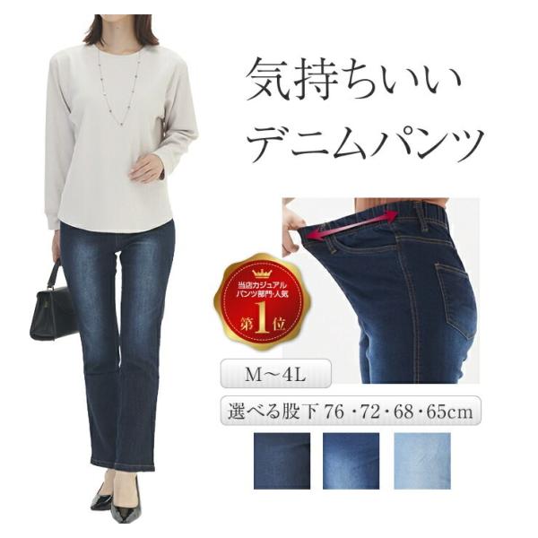 デニム レディース 大人 デニムパンツ ストレッチ ストレート ゆったり ハイウエスト ウエストゴム レギンスパンツ 股上深め ズボン ジーンズ ジーパン