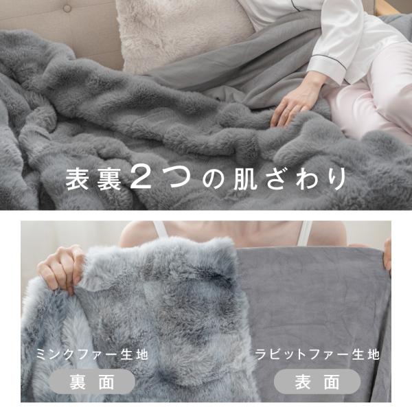 【表裏2つの肌ざわり】表面はラビットファー生地、裏面はミンクファー生地の2種類を縫い合わせて1枚の毛布に仕立てています。超極細繊維のマイクロファイバーはシルクのような肌ざわり。空気を含みやすく、軽さも暖かさもキープします。