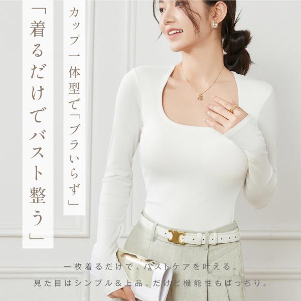 【インナーブラ一体型ニット】一枚着るだけで、バストケアを叶える。見た目はシンプル&上品、だけど機能性もばっちり。カップー体型で、ブラジャー要らずの快適さ。リラックスタイムも、自分らしく心地よく。ノンワイヤー仕様で立体カッティングも丁寧に仕上げた縫製。