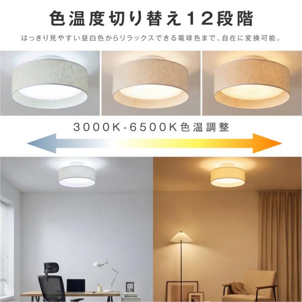 【12段階調光・調色】12段階の調光・調色は自由なライティングが可能です。裏面発光により浮遊感のある間接照明の上品な印象を与えます。リモコンで光の色と明るさを変えられるから、暮らしのシーンやお部屋に合わせて手軽にあかりの切り替えが出来ます。