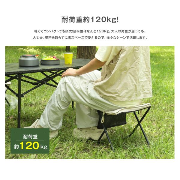 "【耐荷重約120kg!】軽くてコンパクトでも頑丈!耐荷重はなんと120kg。大人の男性が座っても、大丈夫。場所を取らずに省スペースで使えるので、様々なシーンで活躍します。"