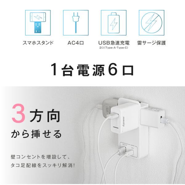 電源タップ コンセント USB Type-C 全6色 壁挿し 電源 タップ 急速充電 直挿しタップ 固定 収納 壁 安全 雷ガード スマホスタンド 4AC+2USB 6個口 Type-A おしゃれ 便利 自宅 旅行 火災防止