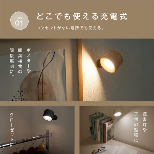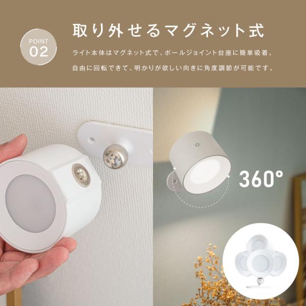 【3D自由回転&USB充電モード】ライト本体はマグネット式で、ボールジョイント台座に簡単吸着。自由に回転できて、明かりが欲しい向きに角度調節が可能です。コードレスで使いやすさ抜群。USB充電でいつでも手軽に充電。
