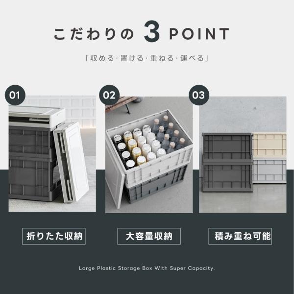 【簡単に折りたためる】コンパクトに折りたためる「折りコン」スタイル。車内では上に荷物が置けて、積み重ねも。折りたたんで帰りはすっきり片付きます。 【抜群の収納力】調理器具、寝具、雑貨や食材などがたっぷり収納。上フタはアップロック式でがっちり固定されて安心です。用途に合わせて、自由に組合せ!リビングや寝室などインテリアとして実用性と美しさを兼ね備えています。