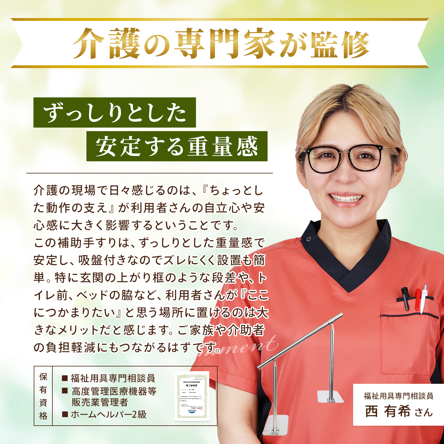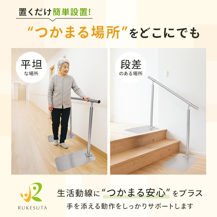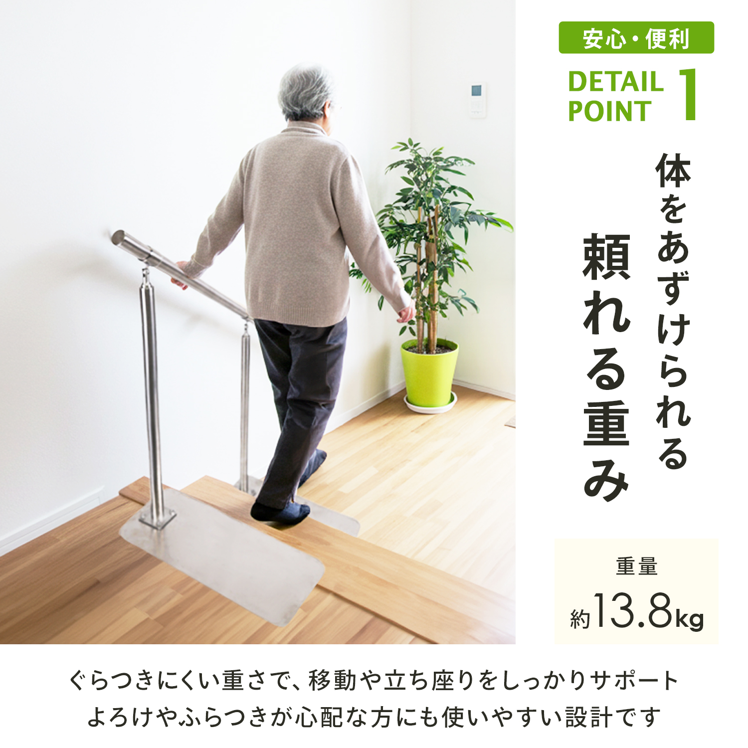玄関や階段の段差に設置できる据え置き型手すり。吸盤と約13.8kgの重みでズレにくく、床に置くだけでしっかり安定。工事不要で簡単設置!