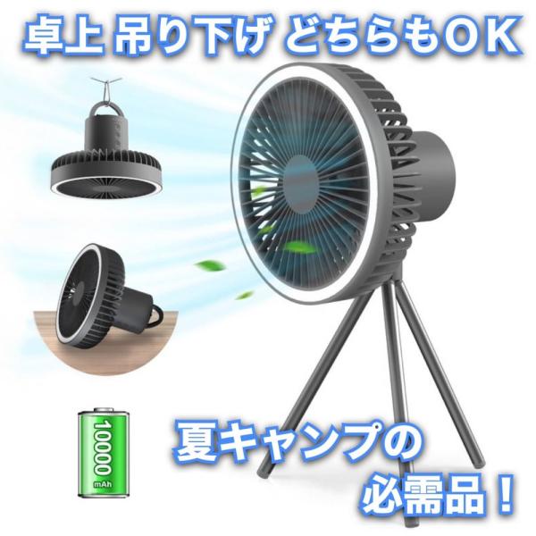 キャンプ扇風機 充電式 アウトドア 3脚 コードレス 静音 切タイマー 風量3段階調節 LEDライト Type-C充電 上下風向調節 吊り下げ 大風量