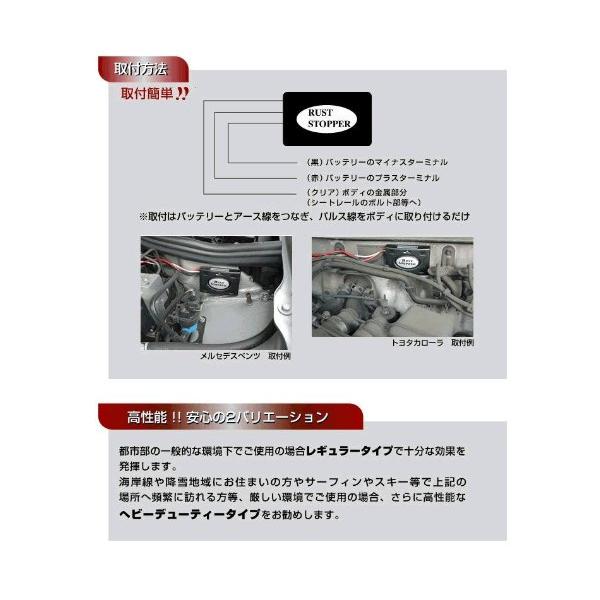 ボディに電子パルスを流すことで鋼板の腐食作用を消滅させます。車自体をさびにくくする装置です。